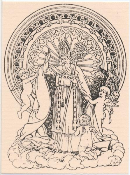 Il est intéressant de rappeler ici le dessin réalisé par ER en 1917 pour la publication déjà signalée et intitulée, « Ma Légende - Souvenir de la Foire de Saint-Nicolas ». A part l’adjonction de Père Fouettard, dictée par la réalité de 1949, on constate que, dès ses premières interventions dans ce thème, l’artiste avait rêvé le cadre idéal qui entre cette année-là - et pour toujours -dans la réalité. Les angelots ont changé de style, l’académisme ayant cédé la place aux simples costumes des trois enfants glaneurs. L’âne reste pour le décor: en réalité, il n’aurait jamais pu monter les tortueux escaliers de la Tour. Il attend dans la rue, où les enfants profitent de lui faire fête.